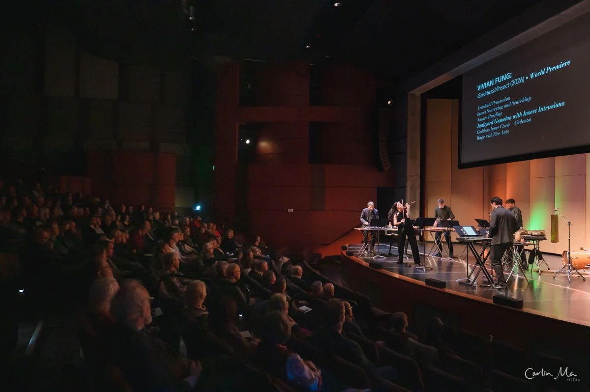 This piece explores so many sounds that the term embodies—little critter sounds against soaring lines of the violin, an improv section that is more dance-like and free, chromatic lines and rustling textures to embody the scurrying creatures. I see Goddess//Insect as a violin concerto of sorts, but in a more adventurous vein, as a percussion orchestra forms the backdrop for this setting. There is an inherent theatricality in the sound world I am seeking to explore, and so, as part of the process of composition, I worked with the performers to maximize the use of spatial possibilities in the room, placement of instruments, and movement of performers.